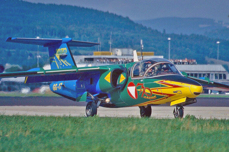 To celebrate 30 years of Saab 105OE operations in Austria, a special commemorative livery was created for the Airpower airshow in 2000. The idea was inspired by the 3rd Squadron / Fliegerregiement 3 at the Vogler Air Base in Hörsching, Upper Austria. The color scheme incorporated all four colors used by the previous squadrons—red, green, blue, and yellow—representing the units stationed at Hörsching and Zeltweg. Each aircraft also featured a letter designation, referred to internally as, for example, the “Yellow Alpha” (YA‑01) or the “Red Bravo” (RB). In addition, the design paid tribute to Austria’s first Saab 105 aerobatic team,…