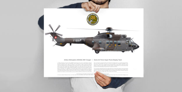 For many years, Gerhard Kempf Grafikdesign and the Swiss Air Force have maintained a close and trusted partnership in the creation of these fine art prints. Each piece is produced with a strong focus on technical accuracy, authenticity, and high artistic standards. Over the past two years, this collaboration has been expanded through partnerships with the Swiss Patrouille Suisse Fan Club and Pinex GmbH, resulting in a series of additional unique squadron prints. These artworks feature the Swiss Air Force’s current display teams, including Patrouille Suisse, the PC-7 Team, the Super Puma Display Team, and the PC-21 Solo Display. All squadron prints are produced in strictly limited editions and are available for purchase online.